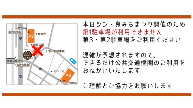 本日10/18(土)はシン・鬼みちまつりが開催されるため、第1駐車場が終日ご利用できません。